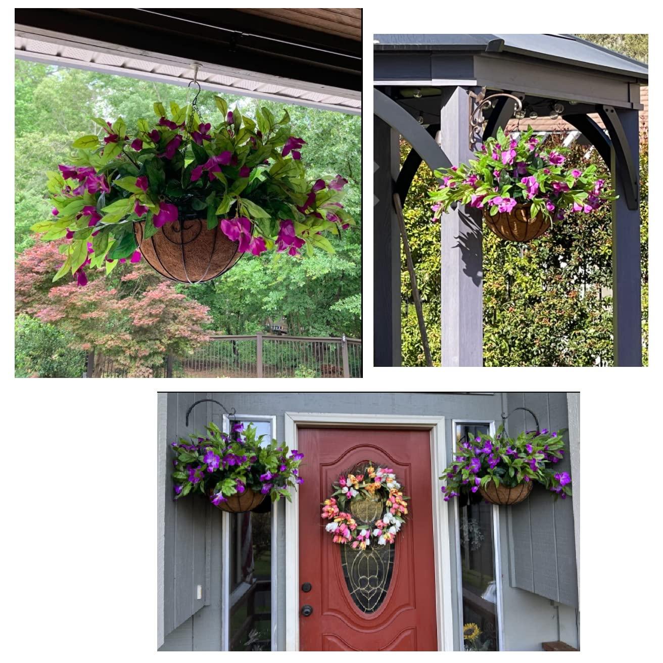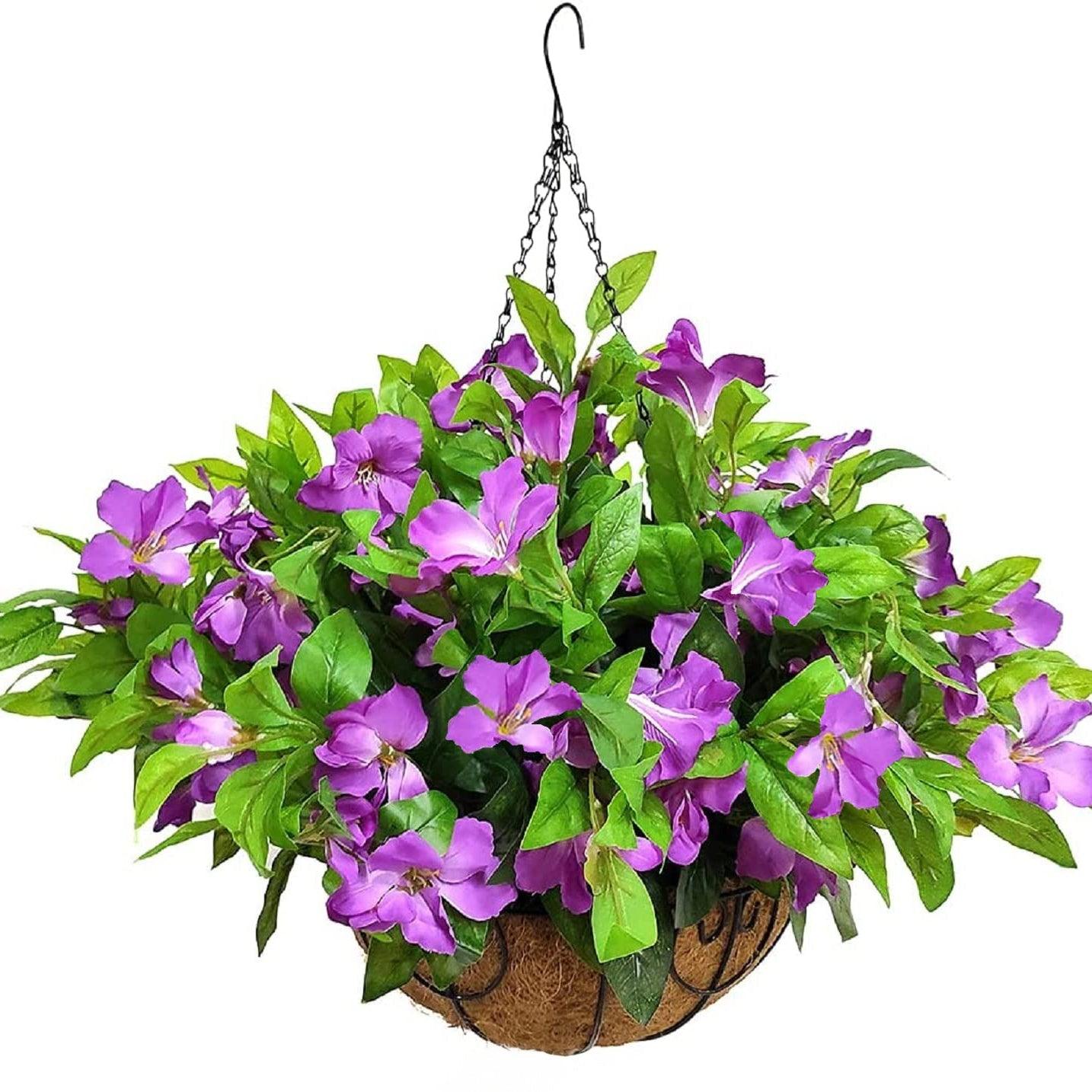 CRAFTSMANSHIP: Adorned with vibrant blossoms and lush leaves, this faux hanging silk flower basket showcases meticulous artistry. It features a cone-shaped basket suspended by metal chains, embracing 4 branches of lifelike azelea artificial flowers. Each hanging branch boasts cascading flower clusters and deep green leaves.